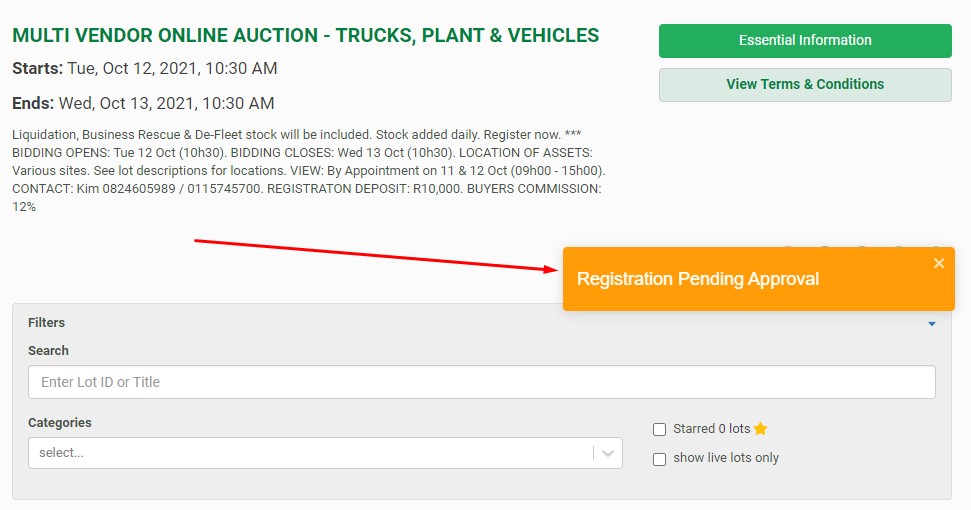 1) Once you submit you registration request, you will see the following confirmation message as well as a notification on the auction, as per below.
