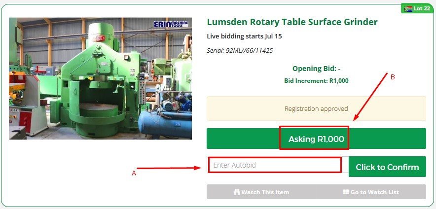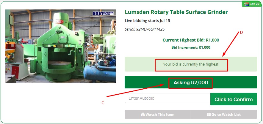 You can place incremental bids (B & C)) during pre-bidding phase also, by clicking the green Asking price button. Your bid status will be displayed (D) notifying you if you are the highest or have been outbid by other pre-bidders.